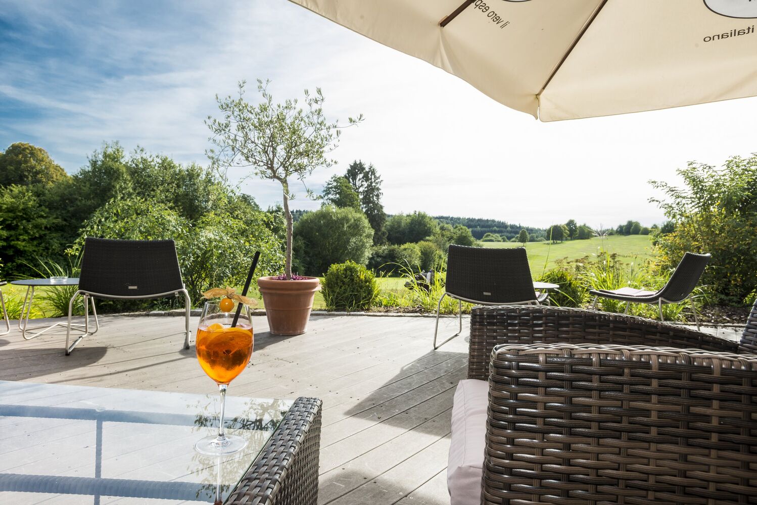 Ein ganz exklusives Schmuckstück ist unsere unvergleichbar harmonisch in die Landschaft integrierte Sonnenterrasse. Hier zu sitzen, mit einzigartigem Blick auf die Spielbahnen 10 und 18 und dabei wunderbar bewirtet zu werden, ist ein herrliches Erlebnis – ein echtes „Coming Home“.